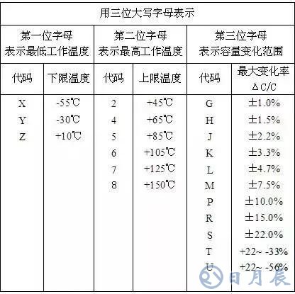 例:X7R表示-55℃~125℃溫度區(qū)間內,以20℃為基準,容量允許變化范圍±15%