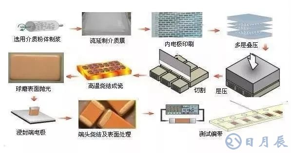 貼片電容結構:將一次性高溫燒結而成,印有內電極的陶瓷介質膜片以一定的錯位方式疊合而成。下面是貼片電容的制造流程圖: