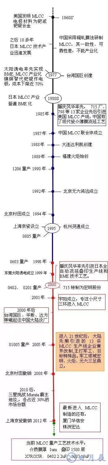 多層片式陶瓷電容器(Multi-Layer Ceramic Capacitors,MLCC)——簡稱貼片電容、片容,日本及臺灣地區(qū)常稱為積層電容或疊層電容,1960年代由美國人發(fā)明,1980年代被日本人發(fā)揚光大并實現(xiàn)用低成本賤金屬量產。
