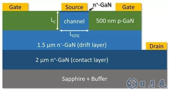研究人員使用低成本的2英寸藍(lán)寶石襯底通過(guò)MOCVD生成準(zhǔn)垂直vc-JFET。之后使用重n型摻雜GaN層實(shí)現(xiàn)背面“虛擬”接觸(圖1)。真正的垂直器件會(huì)使漏極觸點(diǎn)穿過(guò)晶圓的背面 - 這是使用絕緣藍(lán)寶石無(wú)法實(shí)現(xiàn)的。