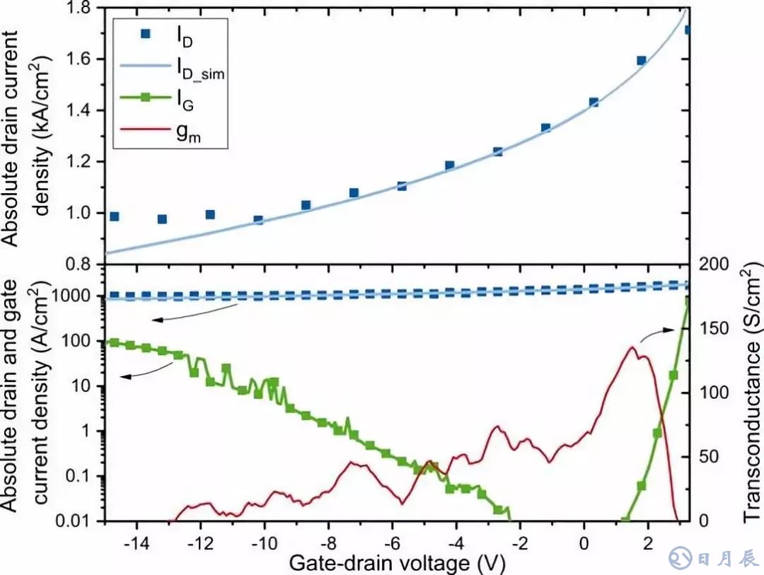 圖2:1V源極 - 漏極偏置下的準(zhǔn)垂直vc-JFET的漏極和柵極電流以及跨導(dǎo),傳輸特性。 標(biāo)準(zhǔn)化為通道橫截面。