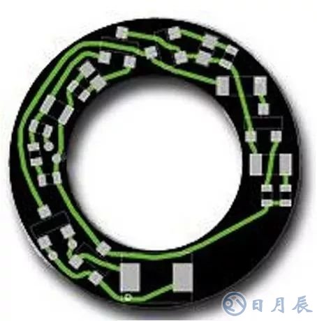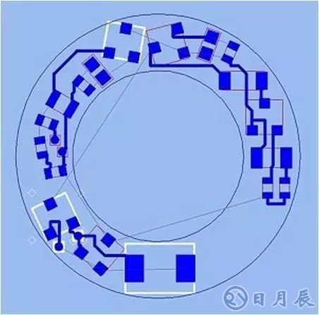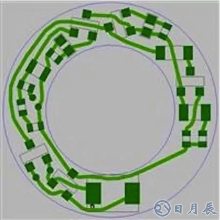 任意角度旋轉(zhuǎn)芯片還可以提供更好的效果。在本例中,面積從23平方厘米縮小到了10平方厘米(圖4底部)。圖5顯示了一塊真實(shí)的PCB。帶旋轉(zhuǎn)芯片功能的任意角度布線是這種電路板的唯一布線方法。這不僅是一個理論,也是得到實(shí)際應(yīng)用的解決方案(有時是唯一可行的解決方案)。