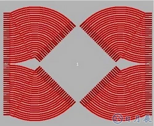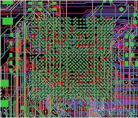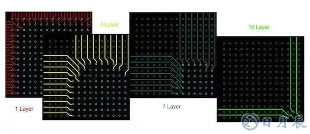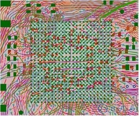 下面考慮BGA元件的布線。在傳統(tǒng)的“從外圍到中心”方法中,到外圍的通道數(shù)量將隨著每個連續(xù)層而逐層減8(由于周長的減?。@?,具有784個引腳、尺寸為28x28mm的元件需要10層。在圖中有些層存在逃逸布線。圖16顯示了一個BGA的四分之一部分。