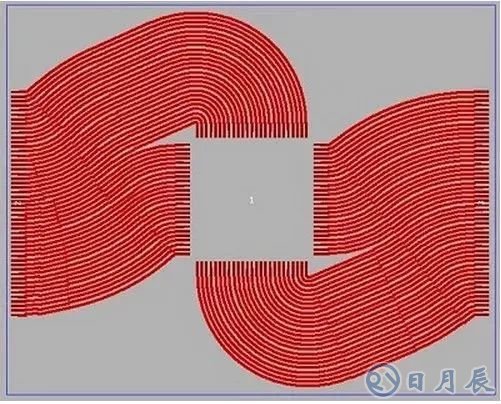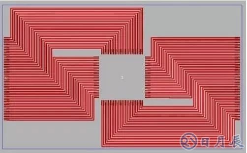 通過自動優(yōu)化導(dǎo)線形狀消除導(dǎo)線打彎(用線段近似弧線只是為了顯示沒有弧線的任何角度例子)。(頂部)原始設(shè)計,(底部)消除打彎后的設(shè)計。紅色打彎導(dǎo)線被高亮顯示,如圖10所示。