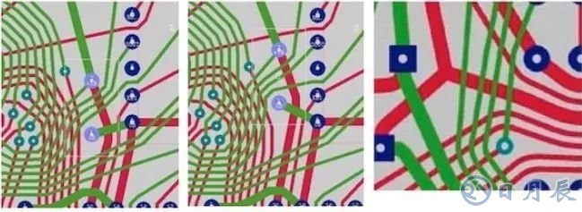 傳統(tǒng)的自動布線器在緊鄰元件之間只能布3根線(見圖3中的左邊和中間)。而任意角度布線時的空間足以在相同路徑上布4根線而不違反設(shè)計規(guī)則檢查(DRC),見圖3右邊。