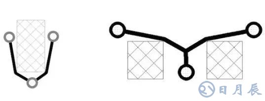 假設(shè)我們有一個正方式芯片,想把芯片引腳連接到另外兩列引腳(見圖4)。只使用90度夾角要占很大的面積(見圖4頂部)。
