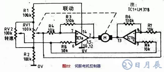 圖22示出了伺服電機的最簡單的應用。電位器RV1由伺服電機帶動。電機可選用電流不超過700mA,電壓為12~24V的任一種伺服電機。圖中RV1 和RV2是接成惠斯登(Wheatstone)電橋。集成電路LM378是雙路4瓦功率放大器,也以橋接方式構成電機驅動差分放大器。