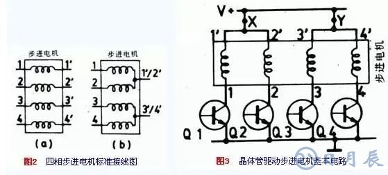 在實際應用中,最流行的還是混和型的步進電機。但工作原理與圖1所示的可變磁阻型同步電機相同。但結構上稍有不同。例如它的轉子嵌有永磁鐵。激勵磁通平行于X軸。一般來說,這類電機具有四相繞組,有八個獨立的引線終端,如圖2a所示。或者接成兩個三端形式,如圖2b所示。每相用雙極性晶體管驅動,并且連接的極性要正確。