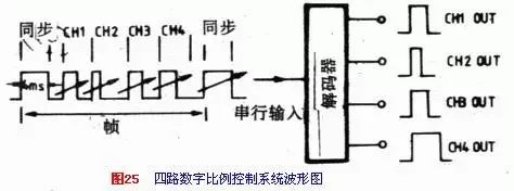 上述伺服電機型常用于多路遙控系統(tǒng)。圖25示出了四路數(shù)字比例控制系統(tǒng)的波形圖。