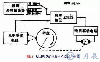 圖23是用方塊圖形式,畫出了測速傳感器伺服電機系統(tǒng),能用作唱機轉盤精密速度控制的原理圖。電機用傳統(tǒng)的皮帶機構驅動轉盤。轉盤的邊緣,用等間隔反射條文圖形結構。用光電測速計進行監(jiān)視和檢測。光電測速計的輸出信號正比于轉盤的轉速。把光電測速計輸出信號的相位和頻率,與標準振蕩器的相位和頻率進行比較,用它的誤差信號控制電機驅動電路。