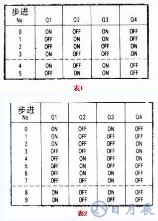 四相混和型步進電機,有一特點很有用處。它可以用半步方式驅動。就是說,在某一時間,步進角僅前進一半。用單個混合或用雙向開關即可實現(xiàn),這種邏輯時序由表2列出。