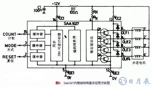 四相步進電機可用幾種專用的集成電路驅動器,SAAl027是其中常用的一種,它的特點是工作電壓范圍寬9.5V~18V;輸出驅動電流大,可達500mA。它適合作四相全步步進電機的控制。圖4是SAAl027的外形和引腳功能圖。圖5(下面↓)是它的內部原理方塊圖及基本應用。
