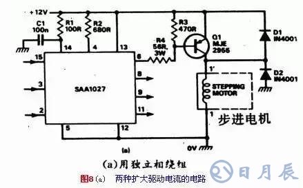 如果希望把電流擴展5A,則采用圖8中的兩個電路。步進電機的每相都需要外加驅動電路,一個四相步進電機,需要增加四個這樣的附加電路。圖8(a))的電路用于驅動電路,一個四相步進電機,需要增加四個這樣的附加電路。圖8(a)的電路用于驅動四個完全獨立的繞組。圖8(b)的電路用于繞組具有公共點步進電機。D1和D2的作用是防止電機的反電動勢損壞輸出級晶體管。