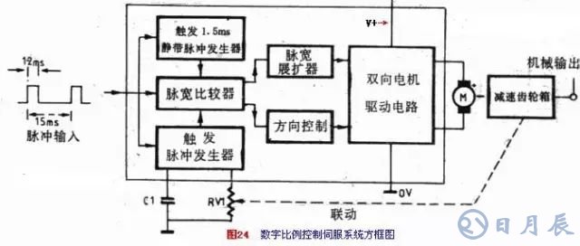 伺服電機的最好類型之一,是用數(shù)字比例遙控系統(tǒng)。實際上這些裝置是由三部份組成:采用集成電路、伺服電機、減速齒輪盒電位器機構。圖24是這種系統(tǒng)的方塊圖。電路的驅動輸入,是用周期為15ms而脈沖寬度為1~2ms的脈沖信號驅動。輸入脈沖的寬度,控制伺服機械輸出的位置。例如:1ms脈寬,位置在最左邊;1.5ms在中是位置,2ms在最右邊的位置。
