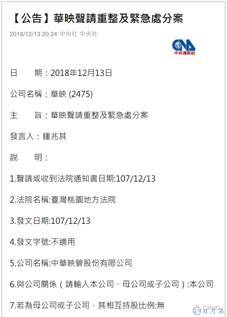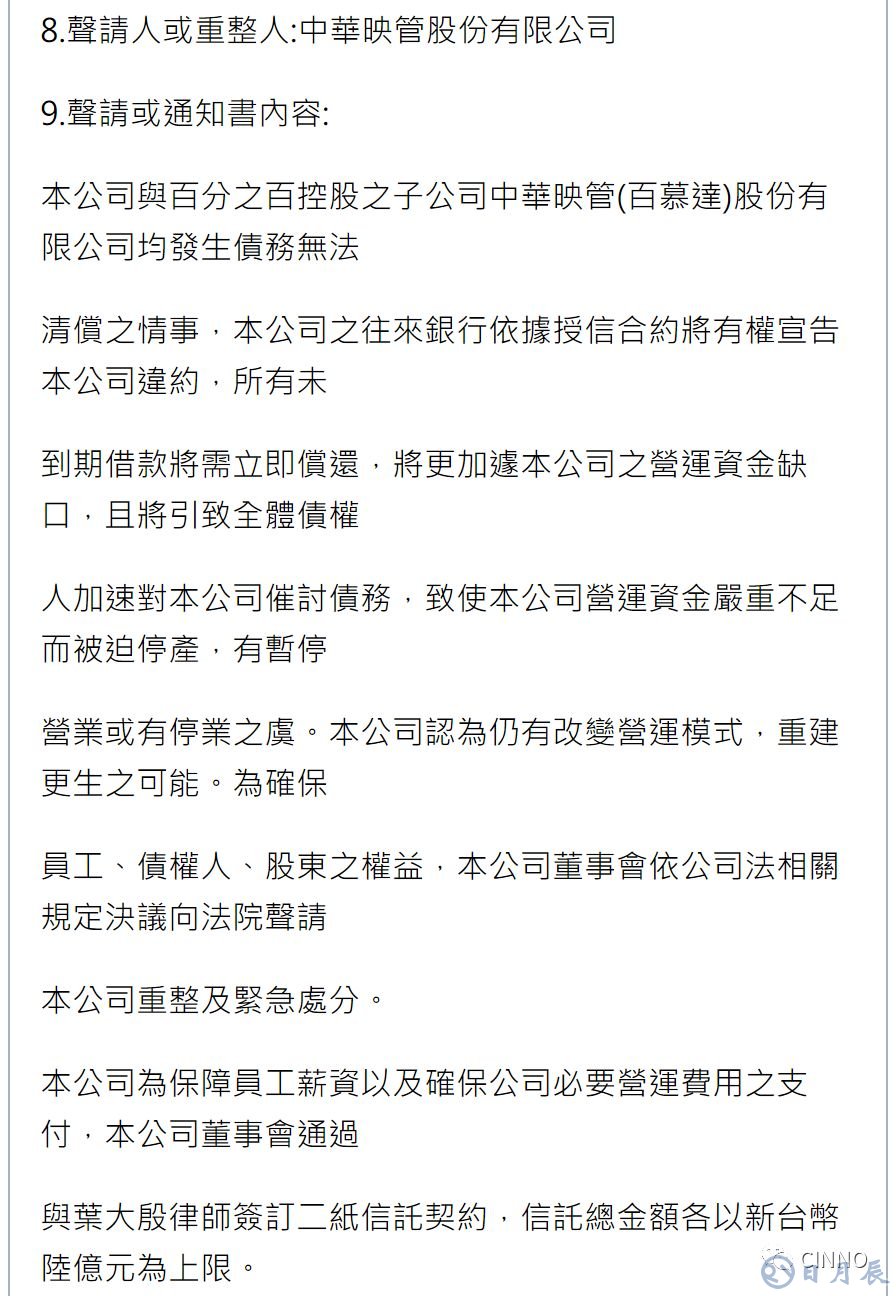 華映強調(diào),該公司認為仍有改變營運模式,重建更生之可能;為確保員工、債權(quán)人、股東之權(quán)益,本公司董事會依《公司法》相關(guān)規(guī)定決議向法院聲請本公司重整及緊急處分。