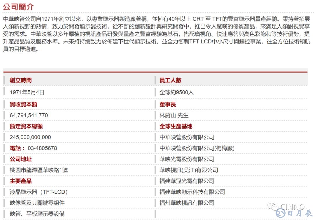 中華映管股份有限公司(Chunghwa Picture Tubes, Ltd.),成立于1971年5月4日,為世界最重要的顯示器制造廠和面板五虎之一。成立初期由大同公司林挺生擔任董事長,亦是大同公司最重要的轉(zhuǎn)投資事業(yè)。該公司是臺灣早期研發(fā)視訊產(chǎn)品關(guān)鍵零組件映像管的重要廠商,早期在映像管時代,其顯示器產(chǎn)量為全球前三大,并因此將臺灣推向“顯示器王國”的世界舞臺。