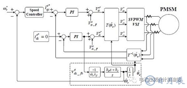 圖1為無(wú)傳感器矢量控制方案的框圖,其中不含位置傳感器??驁D中,軸間控制的正饋?lái)?xiàng)Vds_和Vqs_可以表示為: