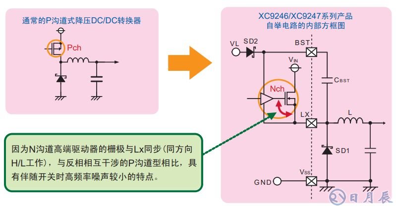 XC9246/XC9247系列產(chǎn)品內(nèi)置的 LDMOS N溝道驅(qū)動器與通常的P溝道驅(qū)動器類型相比,在同樣的導(dǎo)通電阻時,面積 只有后者的1/3以下。因此,在保持低導(dǎo)通電阻驅(qū)動器的同時,還實現(xiàn)了小型封裝。