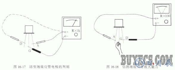 測量用萬用表進行,如圖16-18 所示。將萬用表置R x 100 擋,正表筆接源極S ,負表筆接漏極D. 此時相當于給場效應管加上了一個1. 5V 的電源電壓.萬用表指示出漏、源極間的電阻值已當用手捏住場效應管的柵極時.人體的感應電壓便加到柵極上,由于管子的放大作用,漏極電流ID會增大.使漏、源極間電阻發(fā)生變化.萬用表的表針會發(fā)生擺動。表針擺動的幅度愈大,則表明管子的放大能力愈強;表針擺動幅度愈小,說明管子的放大能力愈