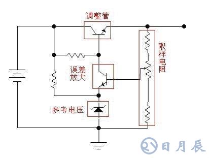 讓我們繼續(xù):如果我們用一個(gè)三極管或者場(chǎng)效應(yīng)管,來(lái)代替圖中的可變阻器,并通過檢測(cè)輸出電壓的大小,來(lái)控制這個(gè)“變阻器”阻值的大小,使輸出電壓保持恒定,這樣我們就實(shí)現(xiàn)了穩(wěn)壓的目的。這個(gè)三極管或者場(chǎng)效應(yīng)管是用來(lái)調(diào)整電壓輸出大小的,所以叫做調(diào)整管。