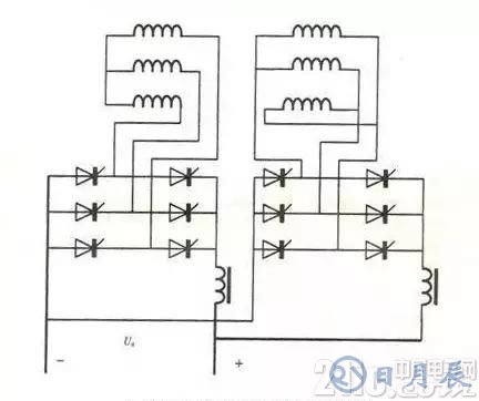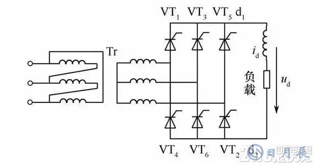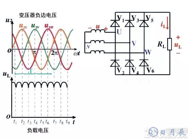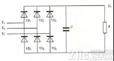 在一個(gè)周期中,每個(gè)二極管只有三分這一的時(shí)候?qū)?導(dǎo)通角為120度)。負(fù)載兩端的電壓為線電壓。