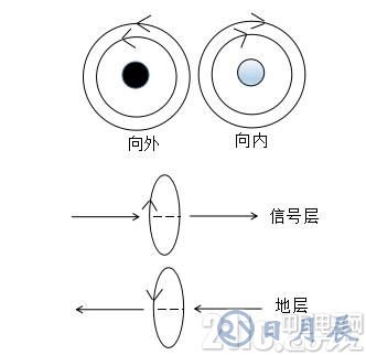 (2)當有兩條彼此靠近且平行的導(dǎo)線,如下圖所示,其中一個導(dǎo)體的電流向外流出,另一個導(dǎo)體的電流向內(nèi)流入,如果流過這兩根導(dǎo)線的電流分別是信號電流和它的回流電流,那么這兩個電流是大小相等方向相反的,所以它們的磁場也是大小相等,而方向是相反的,因此能相互抵消。