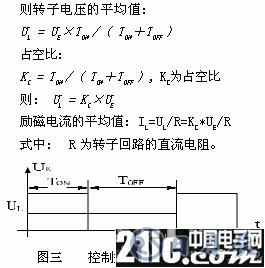 設(shè)三相整流濾波后的直流電壓為UE,IGBT導(dǎo)通時間為TON,截止時間為TOFF。導(dǎo)通時,轉(zhuǎn)子兩端壓降為UE; 截止時,轉(zhuǎn)子電壓等于續(xù)流二極管D7管壓降,忽略為零。如圖三所示。