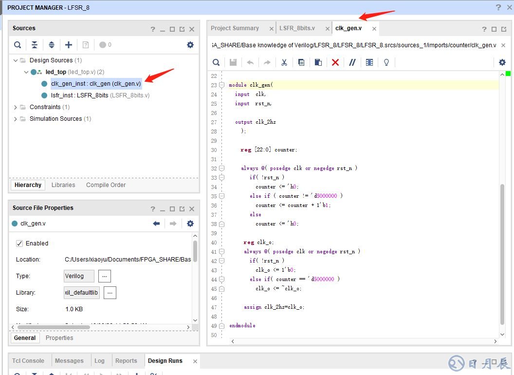 重復(fù)上述操作完成對clk_gen.v(分頻模塊)和led_top.v(頂層模塊)文件的設(shè)計與編碼。