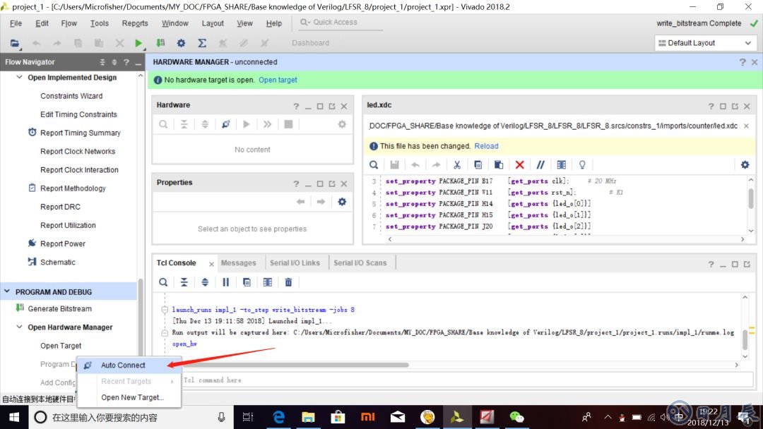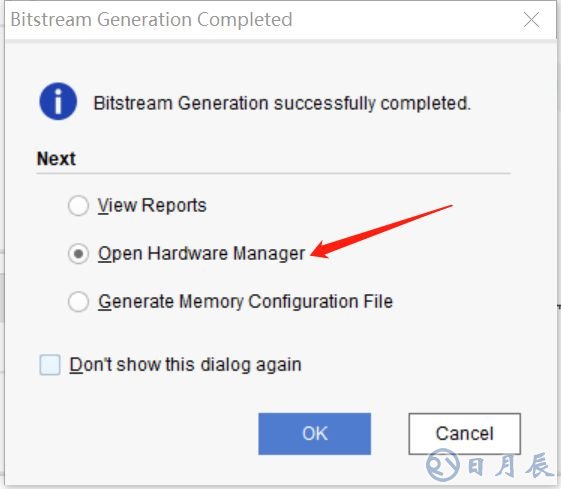 Bitstream文件生成完畢之后,出現(xiàn)如下彈框。接下來選擇Open Hardware Manager,點擊OK。準備上班測試。