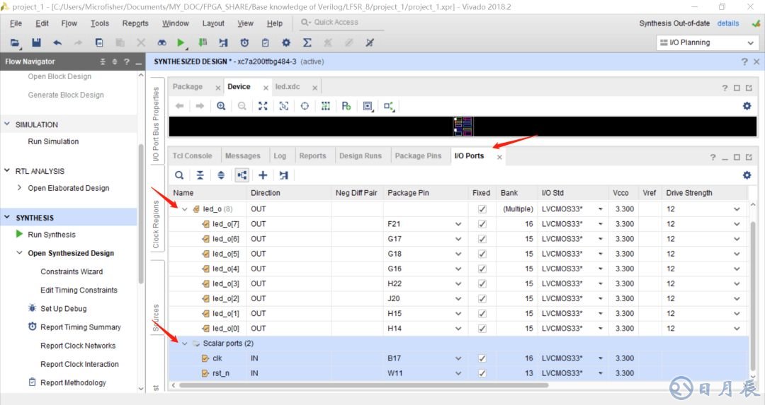 2. 之后在I/O Ports給I/O端口分配引腳。Package Pin就是對應(yīng)的FPGA芯片的引腳。其中clk接外部晶振輸入,rts_n接外部復(fù)位按鈕,led_o接led燈。