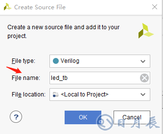 1. 添加testbench文件。在Flow Navigator界面下點擊 Add Sources -> Add or create simulation sources -> Create File,則會出現(xiàn)如下界面,選定文件名(File name),文件類型(File type)。接下來依次點擊OK,F(xiàn)inish, OK完成文件的創(chuàng)建。