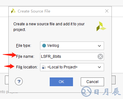4. 指定文件名與路徑(默認存放在工程默認路徑),文件類型(File type)選擇為Verilog,如果你用的是其它硬件描述語言,則選擇你用的語言類型。