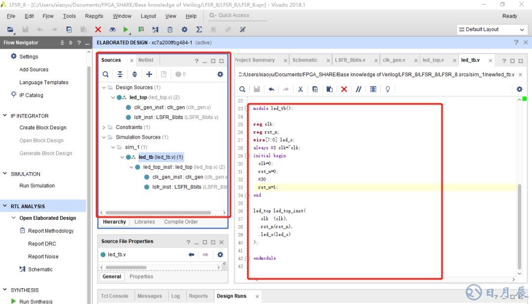 2. 在Sources框找到剛新建的tb文件,雙擊進行編輯,完成編輯后保存。編輯完畢,則如下圖所示。