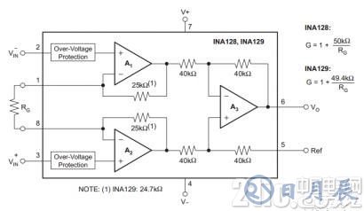 下圖是INA128內(nèi)部結(jié)構(gòu):此圖來自INA128數(shù)據(jù)手冊;電阻式應(yīng)變片電橋壓力傳感器的說明與應(yīng)用解析介紹INA128內(nèi)部電路