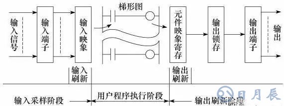 PLC掃描的工作方式主要分三個階段,即輸入采樣階段、用戶程序執(zhí)行階段和輸出刷新階段。如圖所示。