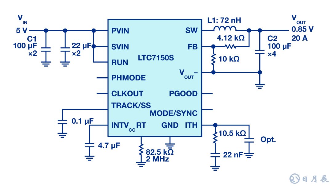 <span]圖1顯示了采用1MHz時(shí)LTC7150S開關(guān)的SoC和CPU功耗的20A解決方案的1.2V輸出。該電路可輕松修改,以適應(yīng)其他輸出組合,包括3.3V,1.8V,1.1V和0.6V,以利用LTC7150S的寬輸入范圍。LTC7150S具有輸出電流能力,可用作第一級(jí)5V電源,隨后可在各種輸出端連接多個(gè)下游第二級(jí)開關(guān)或LDO穩(wěn)壓器。