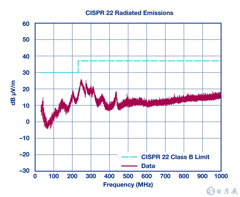 <figure]ADI公司專有的Silent Switcher 2架構(gòu)通過(guò)集成熱回路電容自動(dòng)抵消EMI,最大限度地減少了噪聲天線尺寸。與集成MOSFET相結(jié)合,即使在非??斓拈_關(guān)邊沿,也可顯著降低熱環(huán)中存儲(chǔ)的開關(guān)節(jié)點(diǎn)振鈴和相關(guān)能量。結(jié)果是出色的EMI性能,同時(shí)最大限度地降低了AC開關(guān)損耗。LTC7150S中集成了Silent Switcher 2,可最大限度地降低EMI并提供高效率,極大地簡(jiǎn)化了EMI濾波器的設(shè)計(jì)和布局,是噪聲敏感環(huán)境的理想選擇。LTC7150S通過(guò)CISPR22 / 32傳導(dǎo)和輻射EMI峰值限制,前面只有一個(gè)簡(jiǎn)單的EMI濾波器。圖3顯示了輻射EMI CISPR 22測(cè)試結(jié)果。