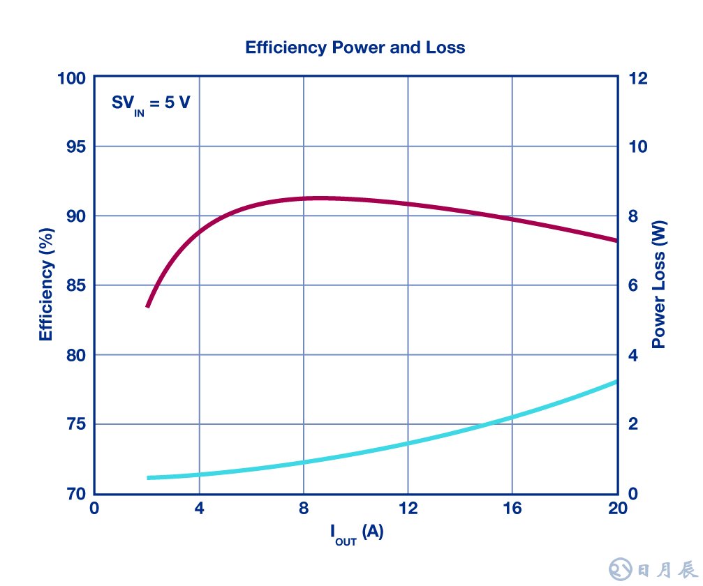 圖1.降壓轉(zhuǎn)換器的原理圖和效率:20 A時(shí)12 V IN至1.2 V OUT
