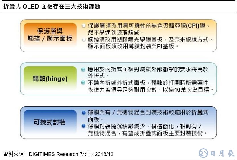 折疊式(foldable) OLED面板存在保護層與觸控∕顯示面板、轉(zhuǎn)軸(hinge)、可撓式封裝等三大課題,在面板廠加速研發(fā)下,漸確立保護層采具可撓特性的塑膠類無色聚酰亞胺(Colorless Polyimide;CPI)膜、觸控采奈米銀線、可撓式封裝采薄膜(thin film)技術(shù)等方向,其中,保護層仍難達(dá)到與既有可撓式面板相同的玻璃觸感,解決難度較高。