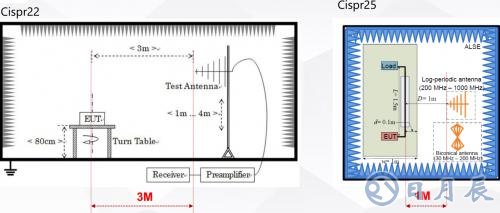如圖3所示電磁干擾的輻射測試普遍采用天線接收法測試,相比于CISPR22來說CISPR25額外增加了150KHz ~ 30MHz的輻射測試,這部分測試頻段覆蓋了DCDC的工作頻率范圍,是輻射測試的難點(diǎn)。另外CISPR-25輻射測試采用1M法天線距離更近,測試接收的信號更強(qiáng)。