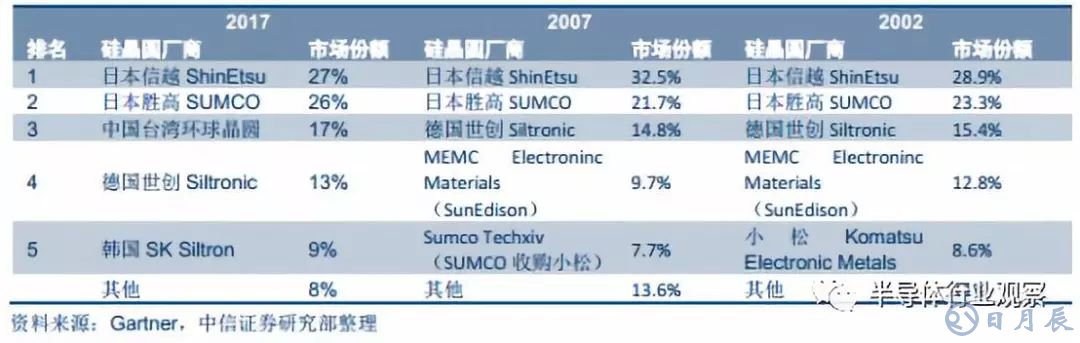 近 15 年來(lái)日本廠商始終占據(jù)硅晶圓 50%以上市場(chǎng)份額。硅晶圓產(chǎn)能未發(fā)生明顯區(qū)域性轉(zhuǎn)移。 根據(jù) Gartner, 2007 年硅晶圓市占率第一日本信越(32.5%)、第二日本 SUMCO(21.7%)、第三德國(guó) Siltronic(14.8%) ; 2002 年硅晶圓市占率第一日本信越(28.9%)、第二日本 SUMCO(23.3%)、第三德國(guó) Siltronic(15.4%) 。 近期市場(chǎng)比較大的變動(dòng)是 2016年 12 月臺(tái)灣環(huán)球晶圓收購(gòu)美國(guó) SunEdison,從第六大晉升第三大廠商。但日本廠商始終占據(jù) 50%+份額。