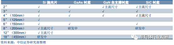 襯底晶圓材料對(duì)應(yīng)尺寸
