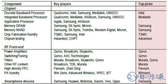 5G將極大推動(dòng)移動(dòng)互聯(lián)網(wǎng)發(fā)展并促進(jìn)開發(fā)如4K視頻和VR/AR等新功能。因此,關(guān)鍵的半導(dǎo)體供應(yīng)鏈部件將獲得額外的收入,比如分立基帶(Discrete B), 應(yīng)用處理器 (AP), 射頻前端 (RF Front-end),天線(Antenna)和功放(PA)將會(huì)受益。伴隨高速網(wǎng)絡(luò)下載大容量文件的需要,5G的閃存用量將比4G增長43%。至2022年5G不斷成熟,類似應(yīng)用處理器)/基帶/存儲(chǔ)器等半成品增長空間將逐漸消失,但由于物聯(lián)網(wǎng)接入終端的普及,射頻將仍有增長潛力。表1是摩根大通整理的主要受益的半導(dǎo)體公司清單: