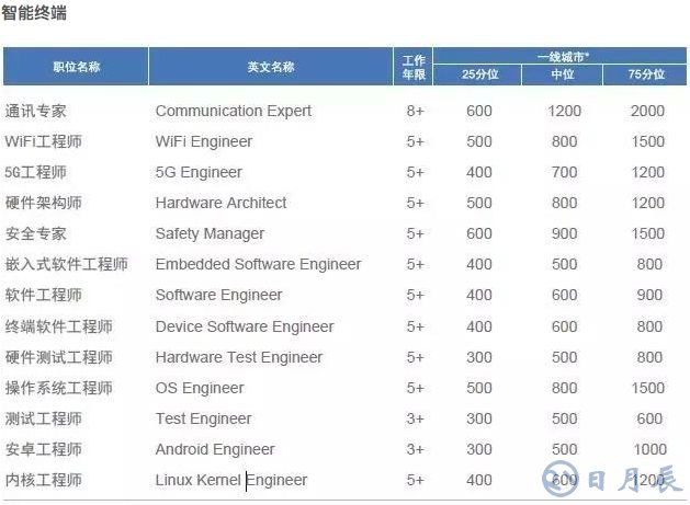 智能終端薪酬硬件類漲幅較小,跳槽漲幅20%左右,軟件部分漲幅20%左右,跳槽漲幅30%左右。其中,軟件算法的智能語音、計算機視覺等人工智能相關的崗位漲幅最大,可達40%以上;
