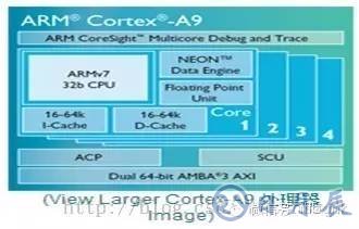 ARM:架構(gòu)采用32位精簡指令集(RISC)處理器架構(gòu),從ARM9開始ARM都采用了哈佛體系結(jié)構(gòu),這是一種將指令與數(shù)據(jù)分開存放在各自獨(dú)立的存儲器結(jié)構(gòu),獨(dú)立的程序存儲器與數(shù)據(jù)存儲器使處理器的處理能力得到較大的提高。ARM多采用流水線技術(shù),此技術(shù)通過多個功率部件并行工作來縮短程序執(zhí)行時間,使指令能在多條流水線上流動,從而提高處理器的效率和吞吐率?,F(xiàn)今ARM7采用了典型的三級流水線,ARM9采用五級流水線技術(shù),而ARM11使用了7級流水線,ARM Cortex-A9更是使用了可變流水線結(jié)構(gòu)(支持8-11級流水線)。在多核心的支持上ARM Cortex-A9最多可支持4個核心,這是ARM系列處理器中首次支持多核心技術(shù)。下圖表示了ARM Cortex-A9的內(nèi)部結(jié)構(gòu)。