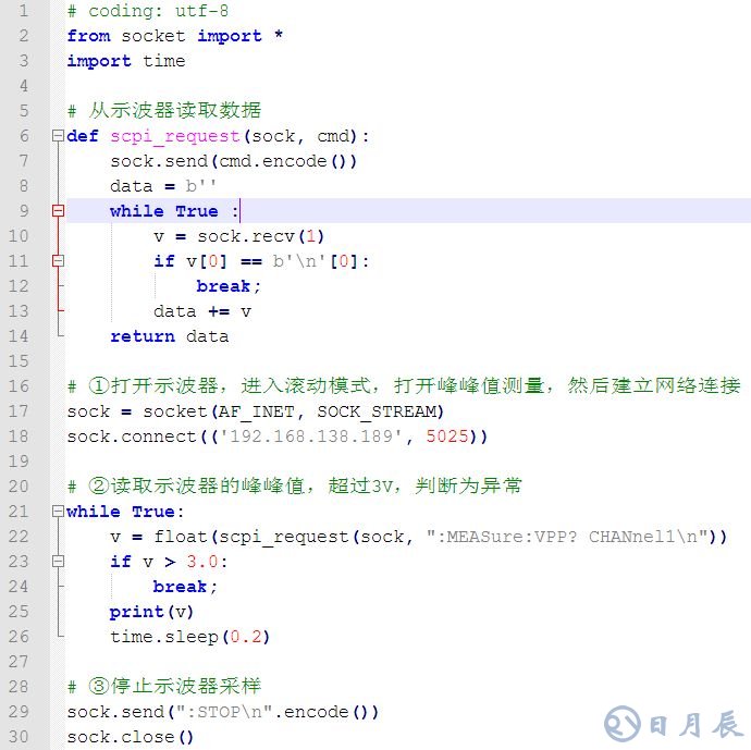 任何東西有利必有弊,滾動(dòng)模式當(dāng)然也有,它的缺點(diǎn):不支持觸發(fā)及觸發(fā)后自動(dòng)停止。也就是用滾動(dòng)來分析問題時(shí),需要用人眼去判定異常,并且在抓到異常后,手動(dòng)停止采樣,這有時(shí)是很困難的。這里推薦一種在線監(jiān)測異常的方法,首先開啟ZDS4000的滾動(dòng)測量功能,其次然后通過網(wǎng)絡(luò)來讀取測量值,判斷是否有異常,最后停止示波器采樣。還是以電壓跌落為例(出問題時(shí)峰峰值為5V),示波器的設(shè)置及python監(jiān)控腳本如下:
