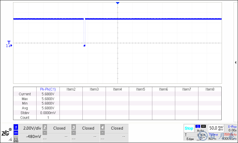 滾動(dòng)模式是“無死區(qū)”的,任何異常問題都可以抓下來,但前提是,采樣率要足夠高。如上圖,采樣率為50MHz,當(dāng)異常的頻率超過25MHz,就很難采集到準(zhǔn)確的波形了。ZDS4000的滾動(dòng)模式,支持最高500MHz的采樣率,最長數(shù)據(jù)采集時(shí)間為7.2個(gè)小時(shí)(此時(shí)采樣率為20KHz)。