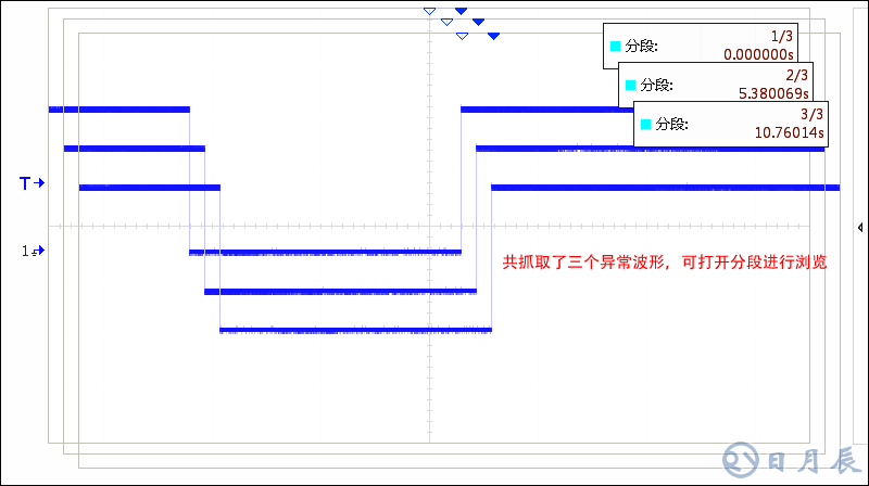 如何多次采集異常?設(shè)置Normal觸發(fā),點(diǎn)RUN運(yùn)行,多次采集后手動(dòng)停止,打開分段存儲(chǔ)(Seg),可瀏覽所有捕獲到的異常。