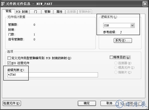 【常規(guī)】標(biāo)簽頁主要用來設(shè)置元件類型的全局效果。“邏輯系列”欄用來選擇相應(yīng)的元件邏輯系列。例如,電容屬于CAP,用C作為參考編號;電阻屬于RES,用R開關(guān)。本例的元件邏輯系列屬于連接器:CON。元件的參考前綴為J。同時“前綴列表”我們添加上*JTAG。默認(rèn)情況下,勾選“ECO注冊元件”選項,表示此元件是ECO注冊元件。推薦常規(guī)設(shè)置如圖3-22所示。