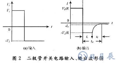 如圖1所示,輸入端施加一脈沖信號Vi,其幅值為+V1和-V2。當(dāng)加在二極管兩端的電壓為+V1,二極管導(dǎo)通;當(dāng)加在二極管兩端的電壓為-V2,二極管截止,輸入、輸出波形如圖2所示。二極管兩端的電壓由正向偏置+V1變?yōu)榉聪蚱?V2時,二極管并不瞬時截止,而是維持一段時間ts后,電流才開始減小,再經(jīng)tf后,反向電流才等于靜態(tài)特性上的反向漂移電流I0,其值很小。ts稱為存貯時間,tf稱為下降時間,ts+tf=trr稱為關(guān)斷時間。二極管兩端的電壓由反向偏置-V2變?yōu)檎蚱?V1時,二極管也不是瞬時導(dǎo)通,而是經(jīng)過導(dǎo)通延遲時間和上升時間后才穩(wěn)定導(dǎo)通,這段時間稱為開通時間。顯然二極管的導(dǎo)通和截止時刻總是滯后加于其兩端高、低電平的時刻。二極管從截止轉(zhuǎn)為正向?qū)ǖ拈_通時間,與從導(dǎo)通轉(zhuǎn)向截止時的關(guān)斷時間相比很小,其對開關(guān)速度的影響很小,在分析討論中主要考慮關(guān)斷時間的影響。